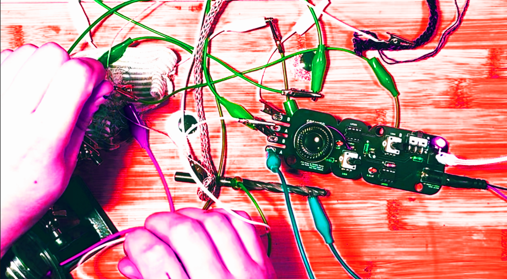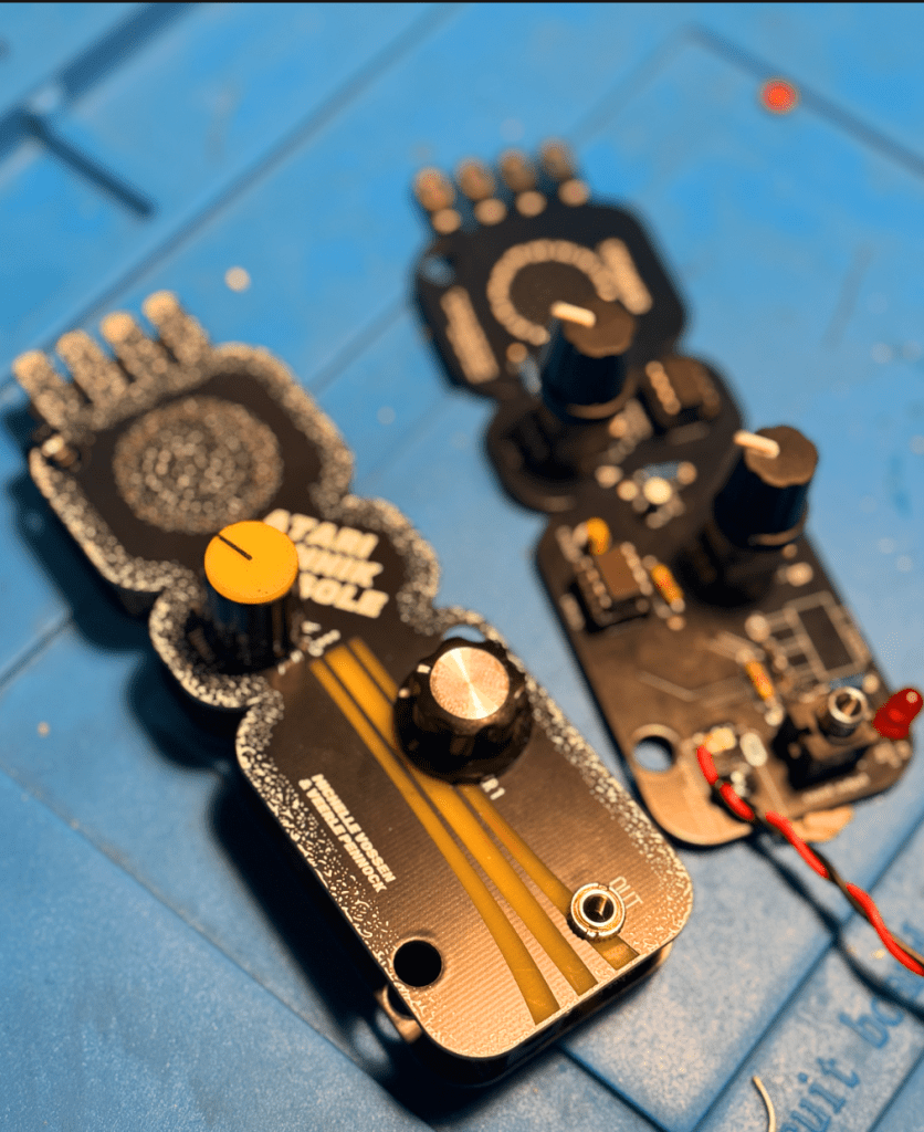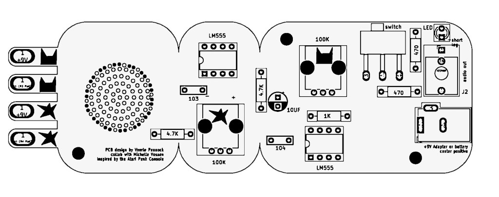 The Atari Punnik Console is based on the famous and well known “Atari Punk Console” diy beginner synthesiser circuit, and works the exact same way, accept it is modded and re-designed to work with touch and conductive materials such as E-textiles, conductive yarn, nails, screws, copper, random dead electronics and body contacts.