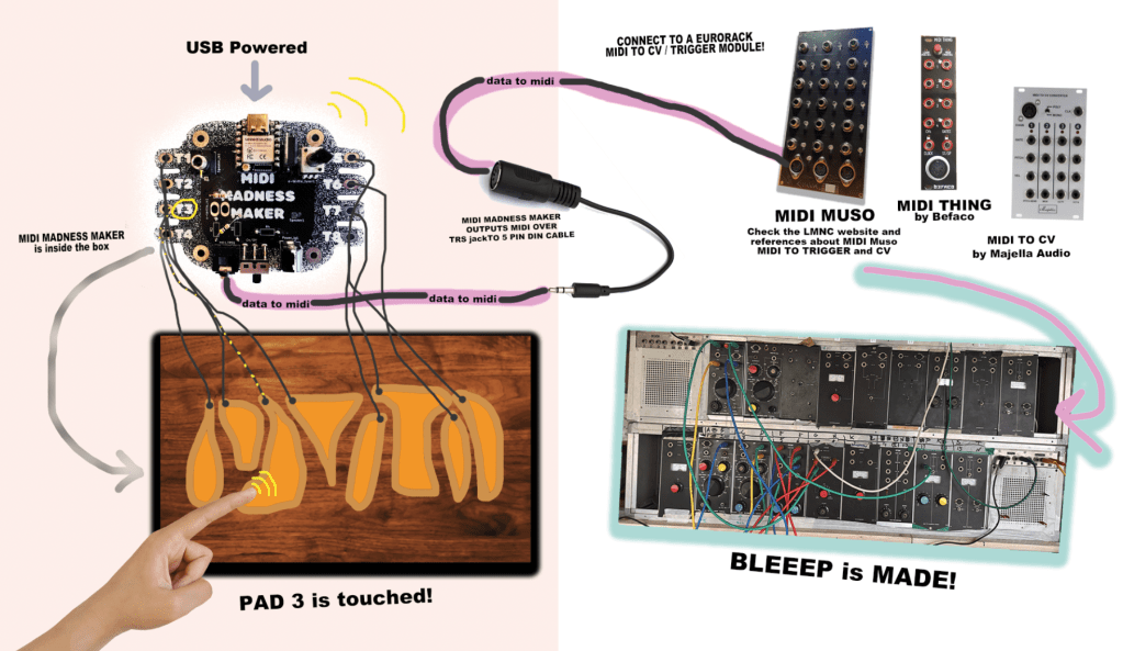Code is fairly simple: you can find the layout of the touch pads of the ESP32 in the Midi Madness Maker repository, or figure them out by searching for the pinout of the microcontroller. Connect your own conductive touch interface to the midi madness maker, and in the code you make use of the Arduino MIDI Library where every time touch happens, it will send a MIDI Trigger or CC blip out over the TRS-mini jack to 5-Pin Din converter. IMPORTANT! There is 2 types of midi in this world, TYPE A ( Korg, MakeNoise) and other TYPE B (Arturia, Polyend) You can find the MIDI type A or B guide here: https://minimidi.world/?