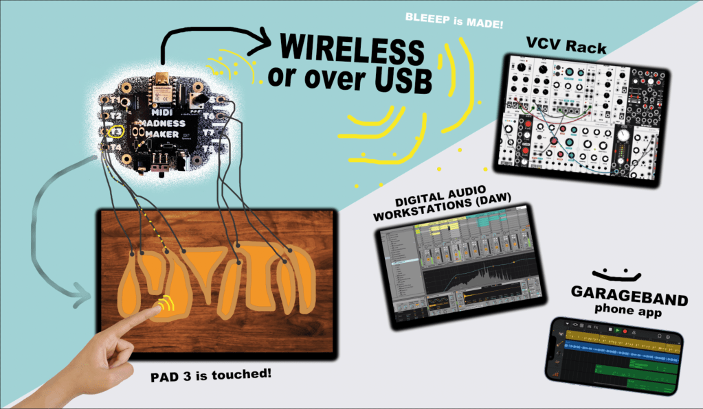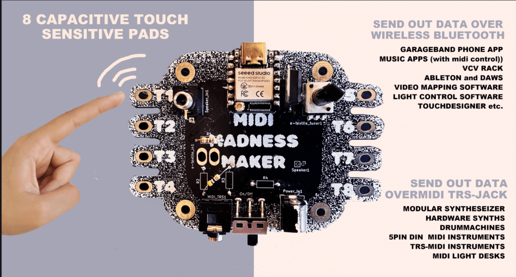 The MIDI MADNESS MAKER, is a standalone DIY syntheseizer and MIDI controller interface you can make yourself with a focus on capacitive touch data. With Midi Madness Maker you can create your own tactile controller translating touch to MIDI control and CC messages over TRS-Midi jack- 5 pin DIN or Wireless over Bluetooth.