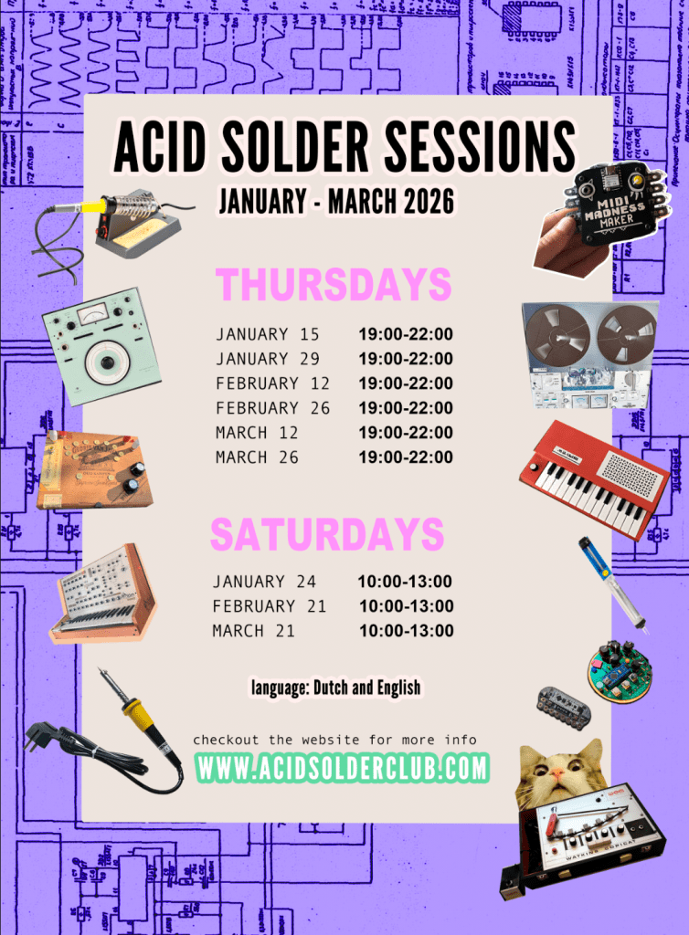 Each solder session is an open lab environment with benches ready, tools available, and a relaxed atmosphere where you can dive into your own project, get feedback, or simply explore how things work and jam out on some machines of the Acid Solder Club studio. Whether you’re repairing a synth, soldering a small circuit or designing your first PCB, this is a space to learn and meet likeminded others.