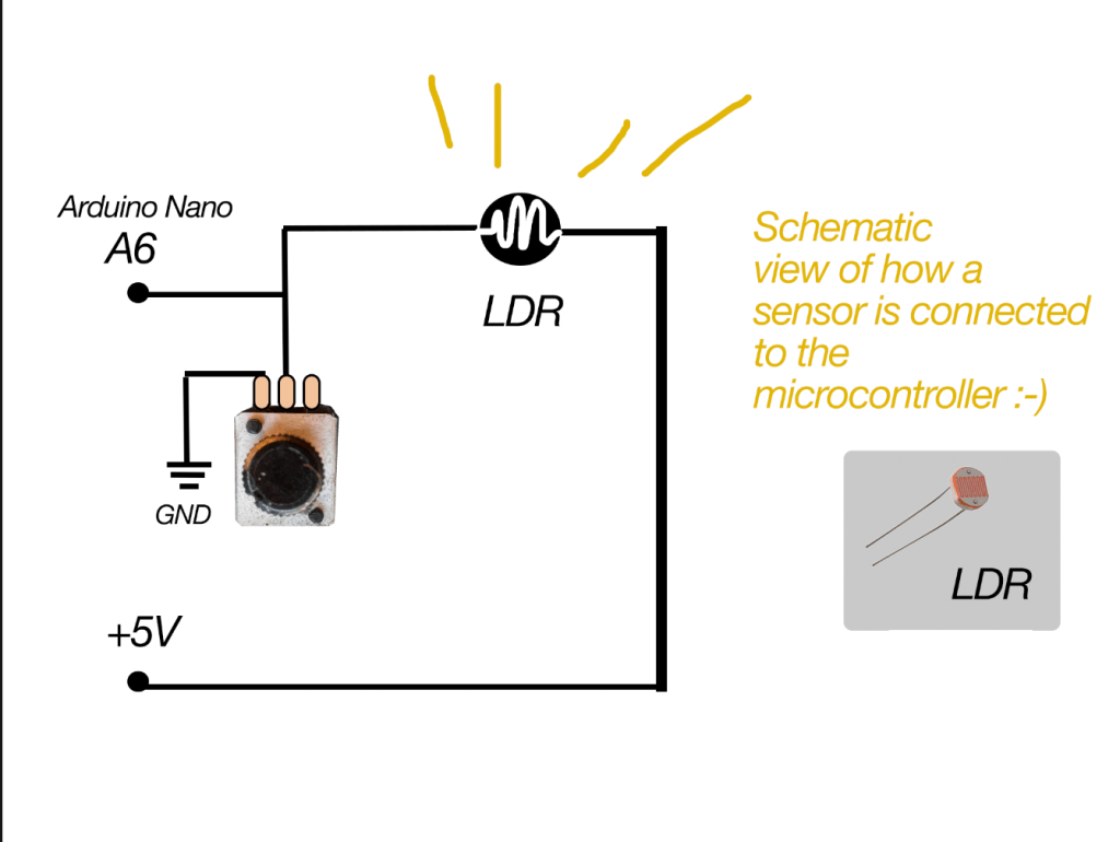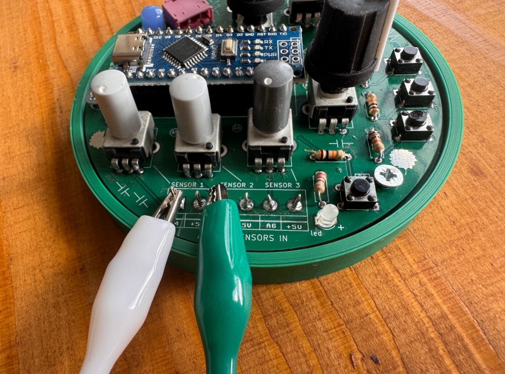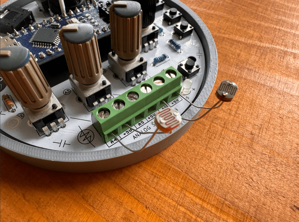 in the schematic representation of Zenith (below) you can see that each sensor input will go trough a potentiometer before connecting to the microcontroller. In this way, the potentiometer acts as a Voltage Divider. Simple explanation: it makes the sensor input variable and adjustable (more or less electricity flow) before it is read by the Arduino. Which is handy if you want to have more or less sensitivity on your sensor.