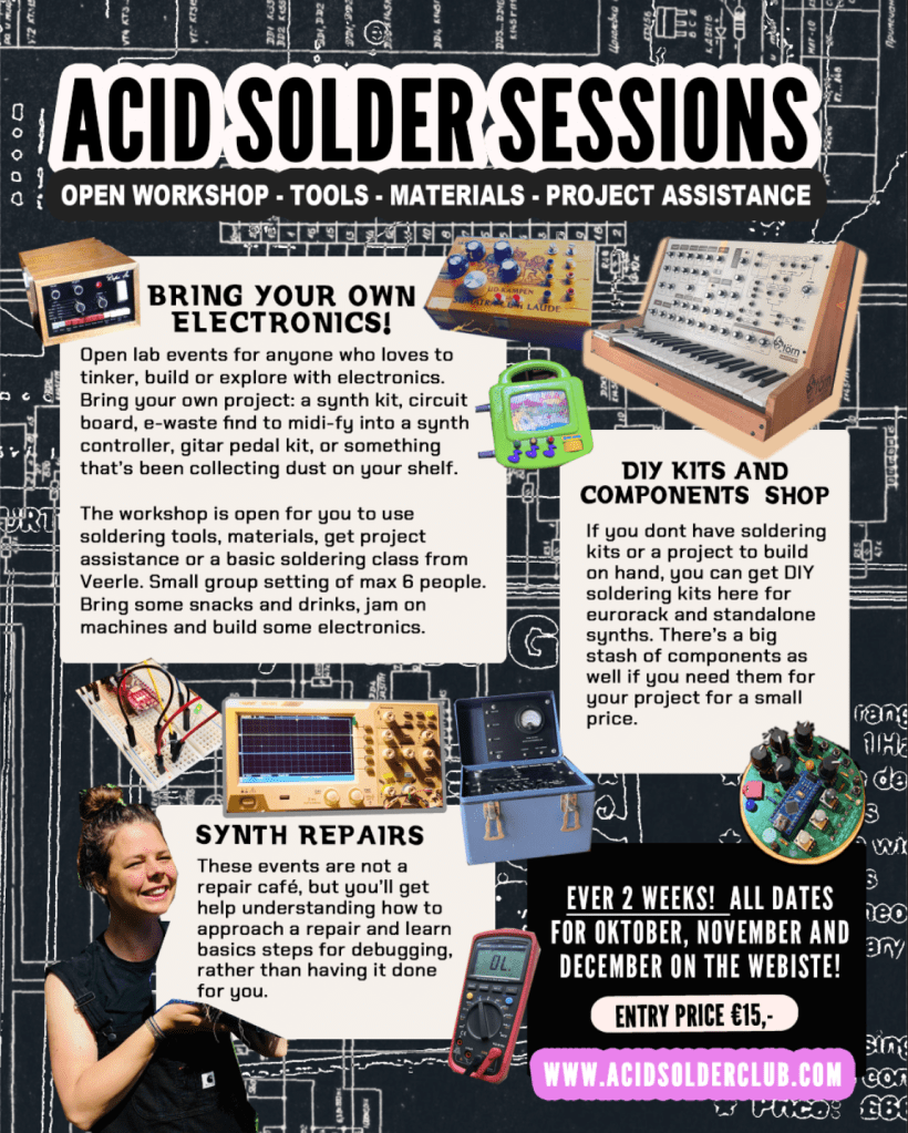 Every other week, Acid Solder Club opens the doors of its workshop in Utrecht to those who are curious about DIY electronics, soundmachines, guitar pedals, soldering and the art of building things yourself. The DIY sessions are part of a growing community in Utrecht and the area where we share knowledge, creative experimentation and provide an accessible learning location for circuit design and electronics.