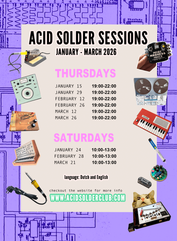 Each solder session is an open lab environment with benches ready, tools available, and a relaxed atmosphere where you can dive into your own project, get feedback, or simply explore how things work and jam out on some machines of the Acid Solder Club studio. Whether you’re repairing a synth, soldering a small circuit or designing your first PCB, this is a space to learn and meet likeminded others.
